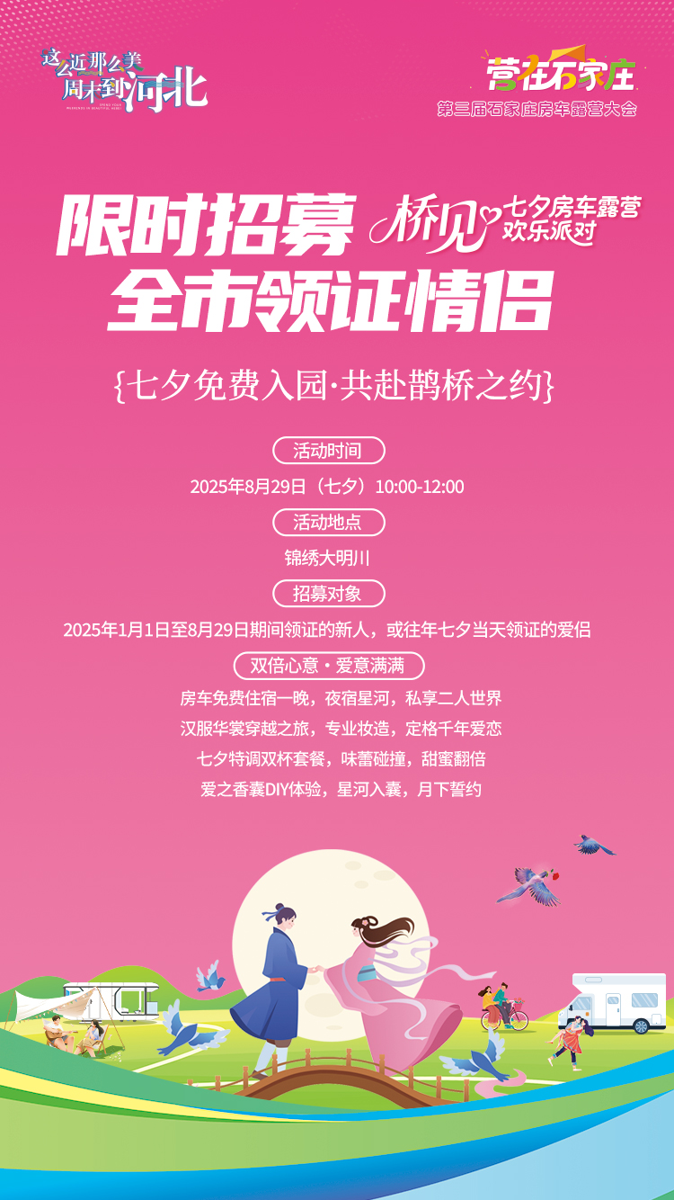 在这个充满甜蜜的七夕佳节,第三届石家庄房车露营大会特别推出“桥见七夕”房车露营欢乐派对,现面向全市限时招募!