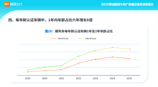 2019年2025年,嘀嗒顺风车每年新增认证车辆中,车龄为1年内和2年内的新车占比整体呈上升趋势,其中2025年新认证车辆中1年内车龄占比,相比2019年增长了6倍,2年内车龄占比增长了超5倍。这一定程度表明,顺路分享空座、共享集约的理念,在新购车车主中日益普及,顺风车可有效帮助有车族降低养车用车成本。
