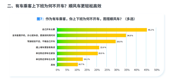 针对为何有车但上下班依然搭顺风车,受访乘客选择前三大理由依次是:“自己开车太累“占45.2%,“坐车能更高效利用时间”占34.8%,“驾驶经验不足,不敢开车”占29%。