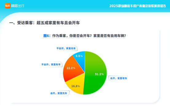 受访乘客中,51.2%表示会开车并且家里有车,16.8%表示会开车但家里无车。这意味着合计有近七成乘客会开车。