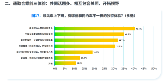 而针对顺风车通勤独特体验,受访用户选择最多的前三项依次是:“都是职场人共同话题更多”占41.4%、“平等互助更容易相互包容关照”占40.5%、“开拓视野,了解更多行业新鲜事”占34.7%。此外,选择“是邻居或上班地点邻近,更有信任感”和“能轻松无负担交流倾诉”的用户分别达32.1%和18.8%。
