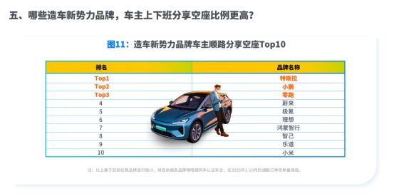造车新势力品牌车主上下班分享空座前五:特斯拉、小鹏、零跑、蔚来和极氪