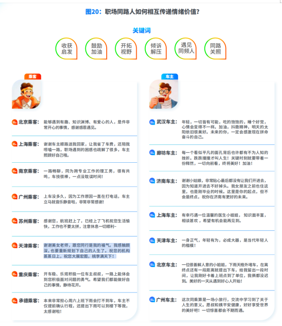 事实上,基于职业和行业的交流,是职场顺风车的独特体验之一,车主乘客同为上班族,不少还是邻居,有更多共同点,更容易打开话闸,建立信任。在2025年,嘀嗒顺风车用户相互传递的近200万朵小红花中,就有大量职场同路人温暖愉悦合乘,相互传递力量的生动记录,六大核心关键词包括:收获启发、鼓励加油、开拓视野、倾诉解压、遇见同频人、同路关照。