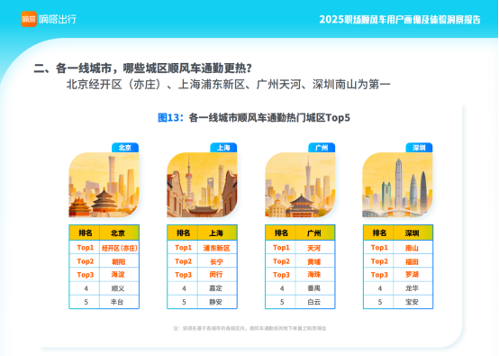 《报告》显示,各一线城市顺风车通勤热门目的地城区,北京前五依次是经开区(亦庄)、朝阳区、海淀区、顺义区和丰台区。其中经开区(亦庄)排名首位,一定程度印证该区域集成电路、新能源智能汽车、生物医药、机器人与智能制造等重点产业发展带动上班族通勤热度提升。