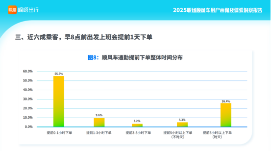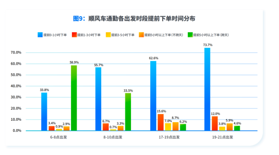 4、提前预约订单在通勤、场站、旅游等各类顺风车场景中占比均较高。在通勤场景中,近45%的顺风车乘客,上下班会提前1小时以上下单。如是早八点前出发,提前一天下单占比达58.9%。