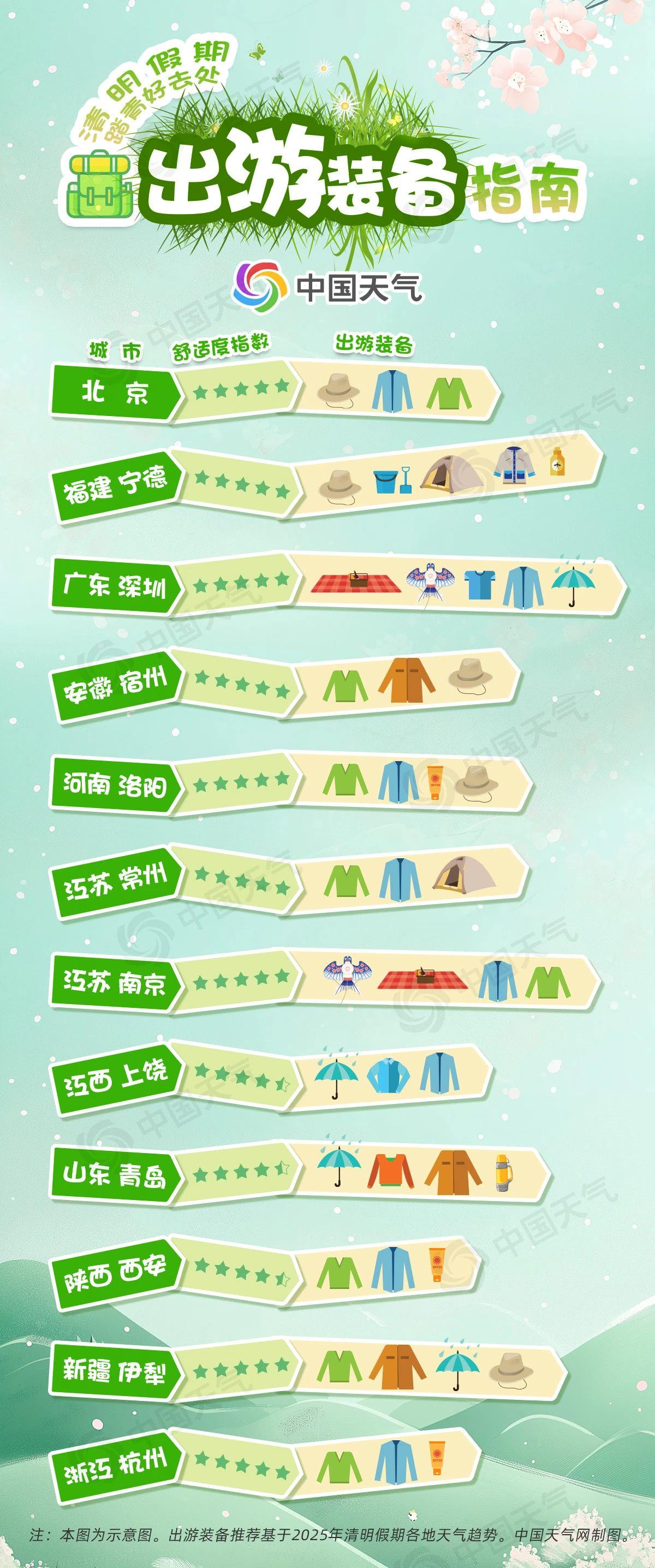 各大旅游平台数据显示,今年清明小长假,踏青赏花、户外、露营等成为清明出游的热门活动,“露营”“户外”“帐篷”等关键词搜索量环比上月增加两倍。户外活动是否舒适,很大程度上取决于天气是否给力。那热门春游地天气如何?带上哪些装备,可以快乐出游呢?