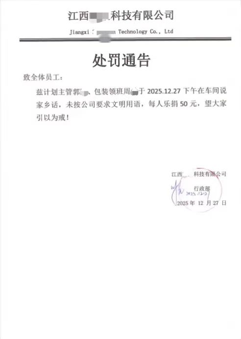 记者看到,这份处罚通告写道:兹计划主管郭某、包装领班周某于2025.12.27下午在车间说家乡话,未按公司要求文明用语,每人乐捐50元,望大家引以为戒。落款为江西某科技公司行政部,时间为2025年12月27日。有网友评论,是不是两人用家乡话骂人才被处罚,发布这则处罚通告的网友回复称,两名员工并未骂人,是在用家乡话谈论工作,新来的经理听不懂。在车间说了几句家乡话就被处罚,不少网友表示了不解,认为这样的规定明显不合理。还有网友质疑,乐捐其实就是变相的罚款,同样不合理且涉嫌违法。