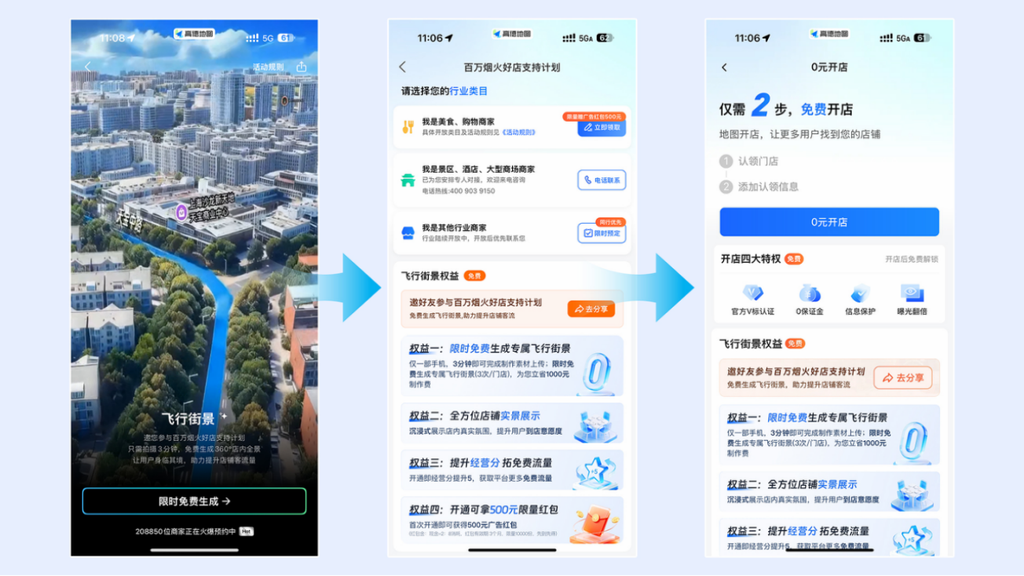 这股热情正迅速席卷全国。自1月7日高德启动“百万烟火好店支持计划”、为商家免费接入“飞行街景”以来,短短5天内,预约商家总数就已突破60万。其中,北京以超5.7万的预约数领跑,杭州和成都也分别以超4.6万和4.4万的预约量紧随其后,商家们火爆的需求一度导致高德咨询电话繁忙,团队需连夜赶工响应。