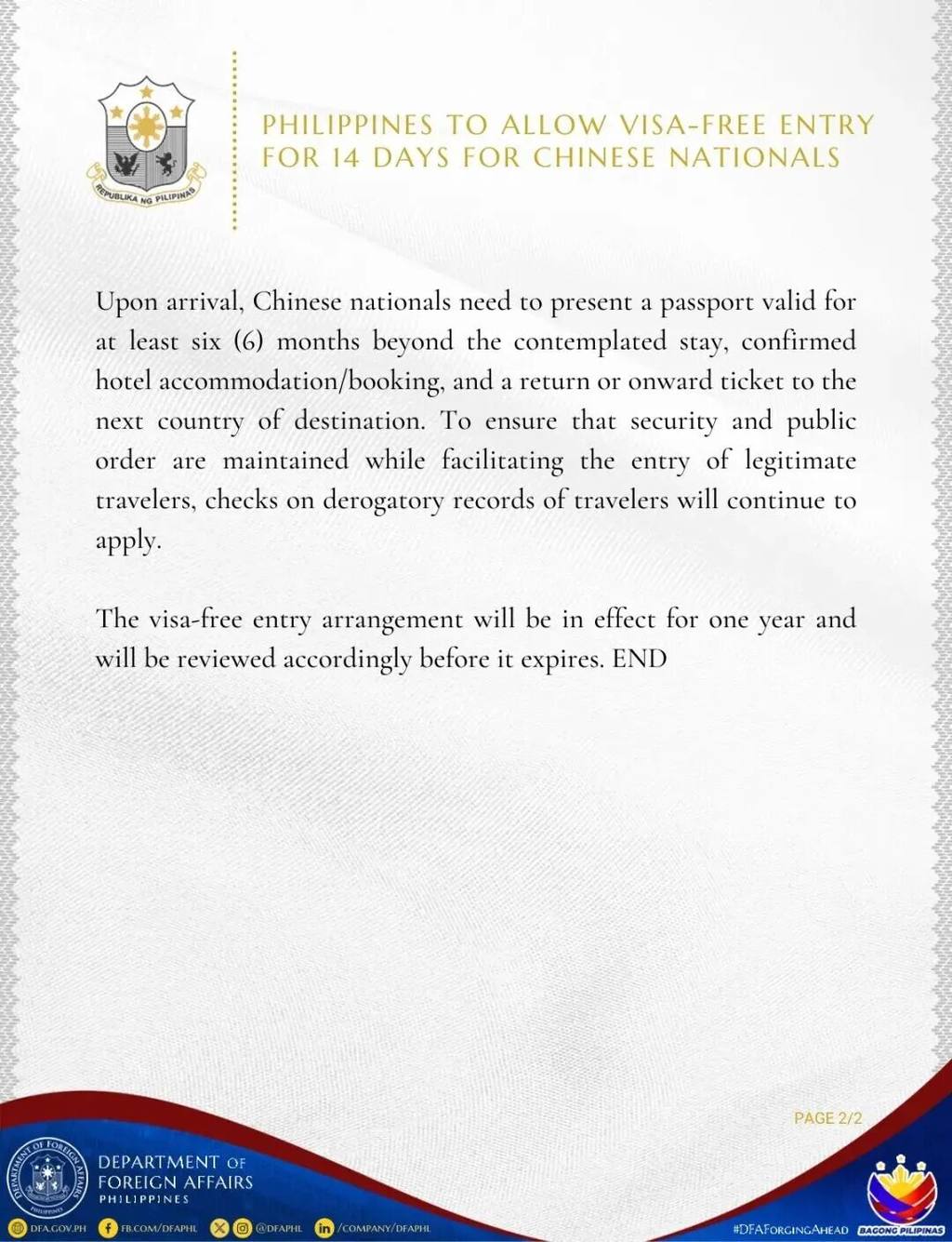 菲律宾外交部表示,这项措施符合总统关于促进贸易、投资和旅游,以及加强两国人文交流的要求。