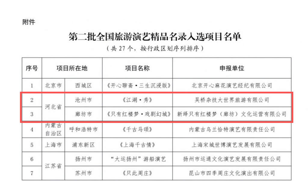 纵览客户端讯 1月15日,文化和旅游部办公厅公布第二批全国旅游演艺精品名录入选项目名单,河北省廊坊市《只有红楼梦·戏剧幻城》、沧州市《江湖·秀》两大演艺项目成功入选。