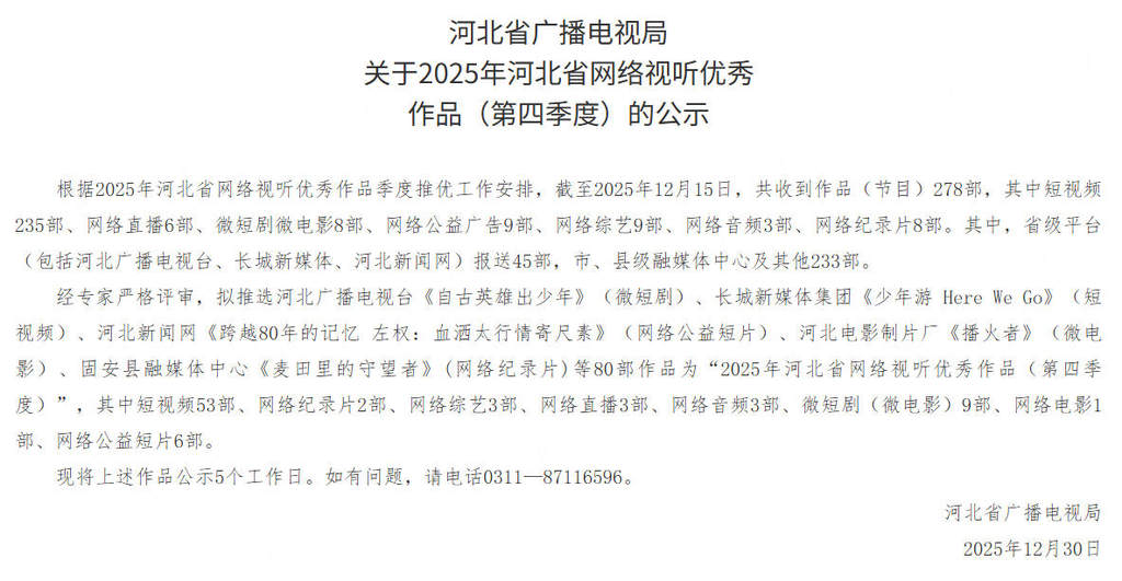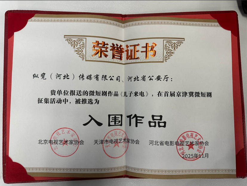 纵览客户端讯 近日,纵览传媒笔尖短剧工作室制作的反诈微短剧《儿子来电》获得多项荣誉,在“首届京津冀微短剧征集推介”活动中,获得微短剧“作品入围奖”。此外该剧还荣获“2025年河北省网络视听优秀作品(第四季度)”。