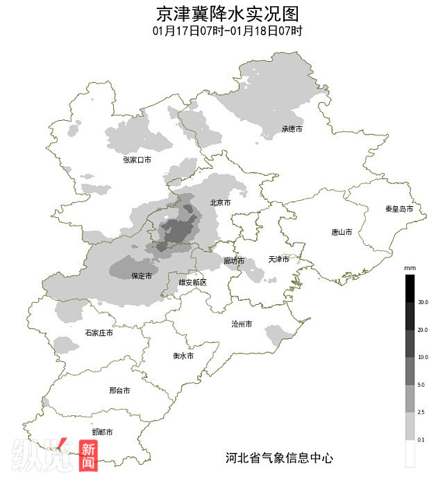 据河北省142个国家级气象站数据统计,1月17日7时至18日7时,张家口中北部、承德北部、保定、雄安新区、廊坊西部、石家庄中西部等地有25个站点出现降雪天气,降水区平均降水量为0.9毫米,保定易县最大为3.8毫米达中雪级别。石家庄城区出现微量降雪。