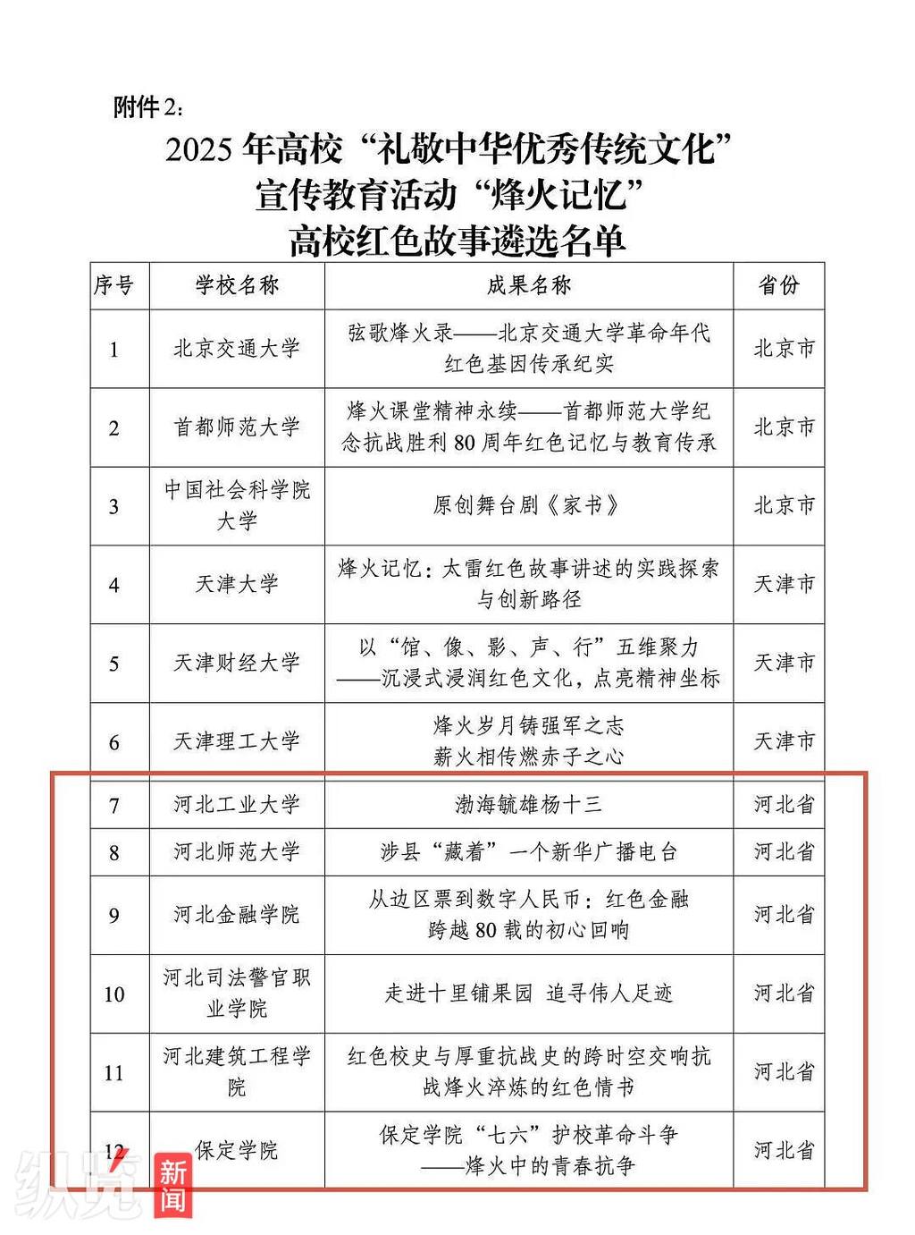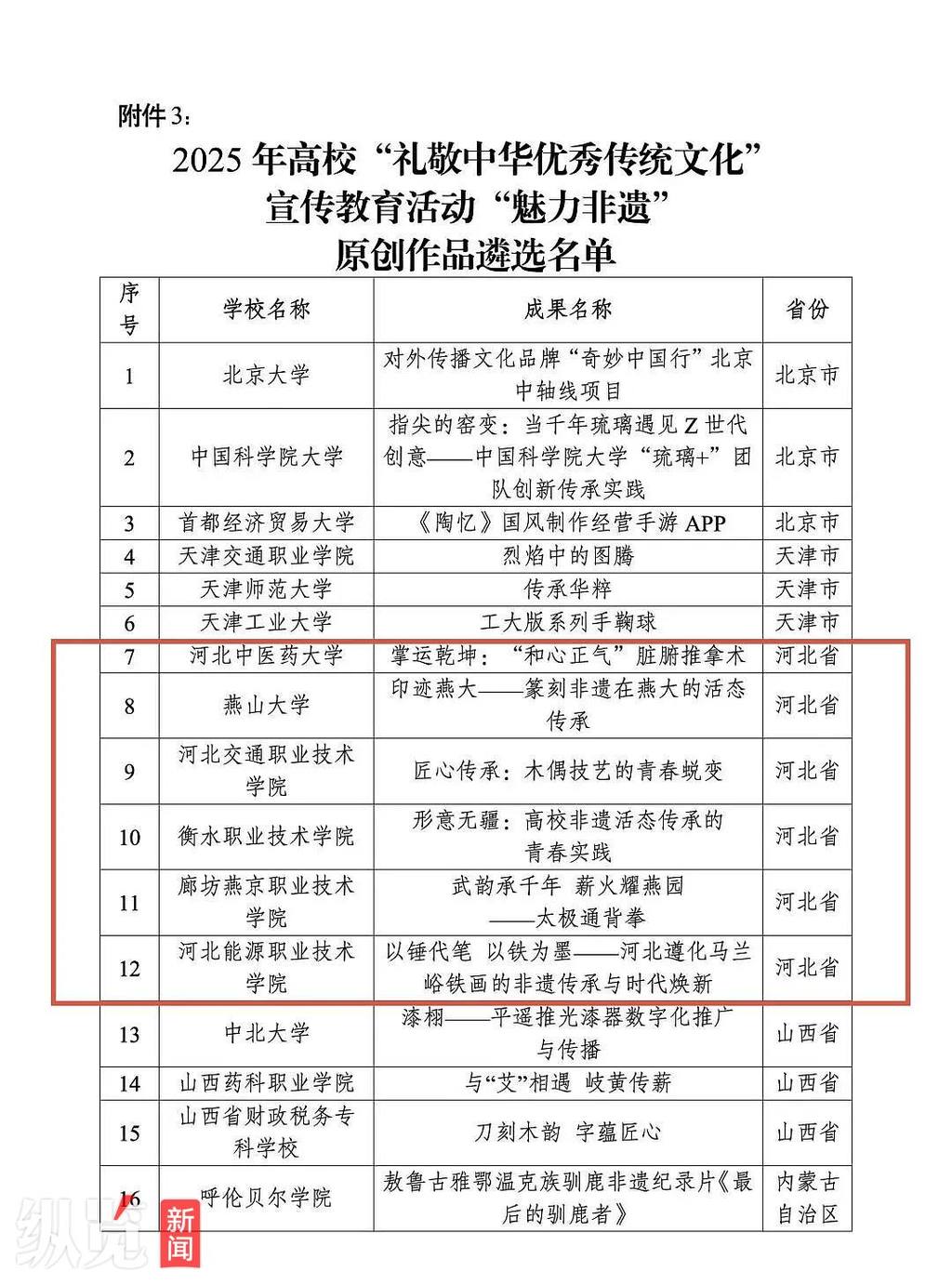 纵览客户端讯(记者郑佳)近日,教育部思想政治工作司发布了关于2025年高校“礼敬中华优秀传统文化”宣传教育活动结果的公示,河北省高校共有17个项目入选。其中,“数智未来”焕活传统文化案例优秀作品5个,“烽火记忆”高校红色故事优秀作品6个,“魅力非遗”原创优秀作品6个。