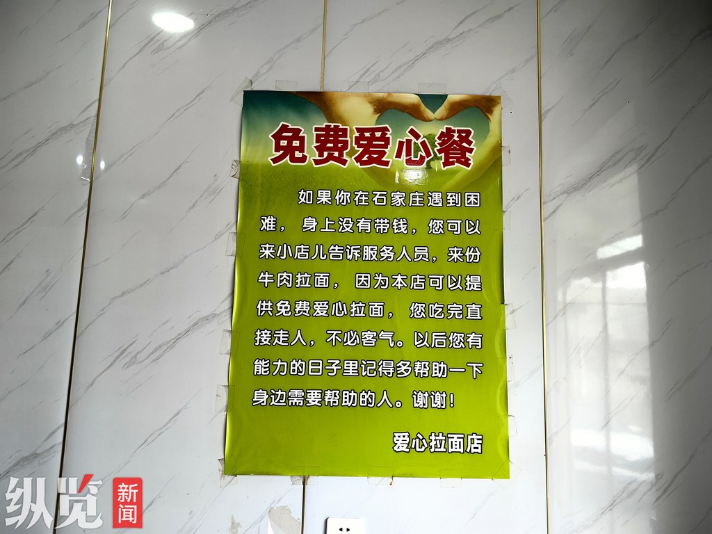 纵览新闻记者联系到这家店的老板冶他亥,今年36岁的青海人。2012年,冶他亥来到河北,在石家庄北站开了自己的第一家拉面店。后来,他在店里挂上了“免费爱心餐”的海报,这一挂,就是9年。“我在北站开店的时候,看到有人在店门口转来转去,不好意思开口,就想着挂个海报,让他们不用为难。”冶他亥回忆起挂海报的初衷,语气朴实又真诚。