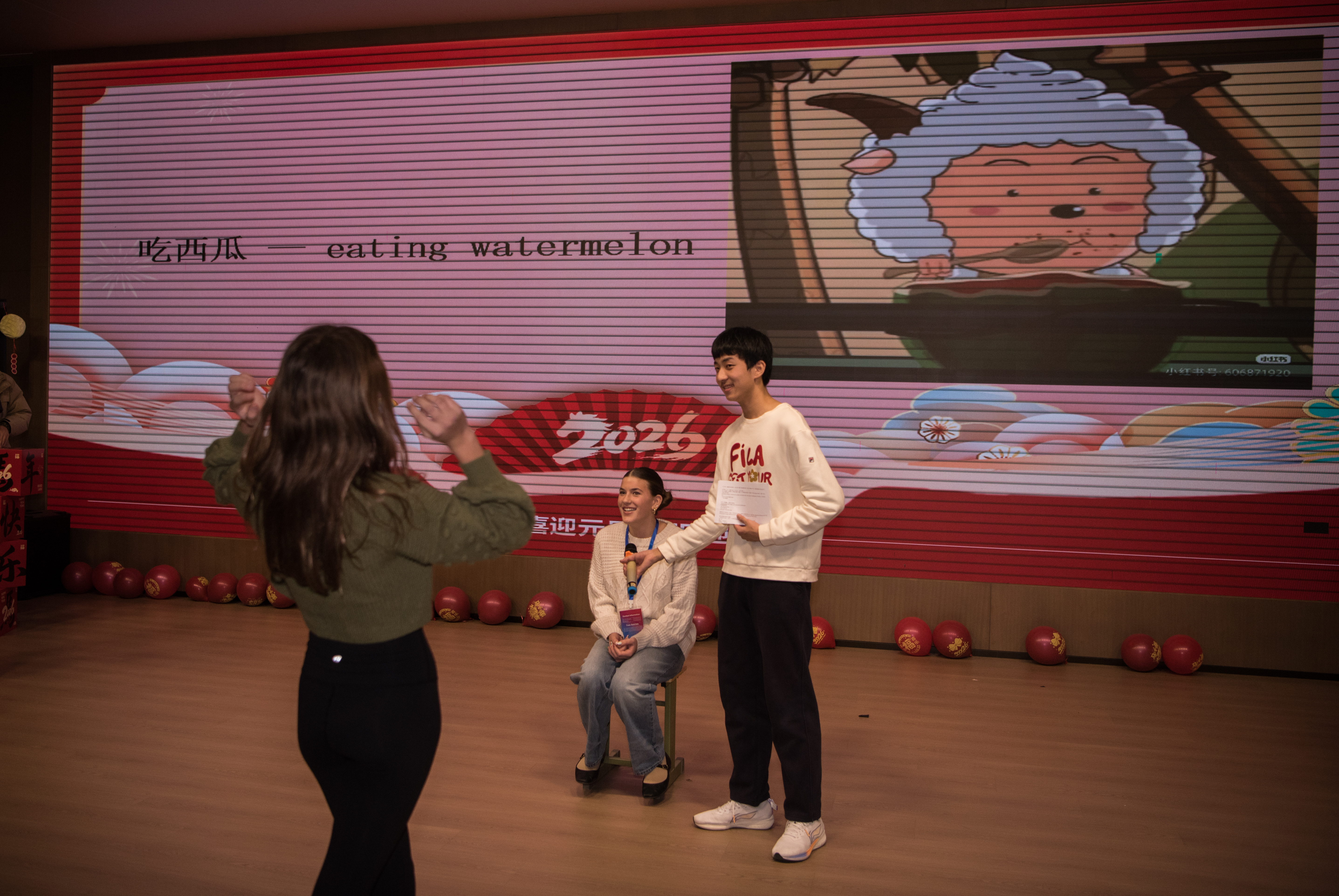 石家庄外国语学校的元旦联欢会充满跨文化互动氛围。中国学生登台展示才艺,带来传统民族舞蹈、潮流音乐、舞台话剧等节目,台下不时响起阵阵掌声。现场还设置了“传声筒”“你画我猜”“数字报团”等互动小游戏,美国学生主动上台参与,与中国学生分组协作、默契配合,欢声笑语不断。