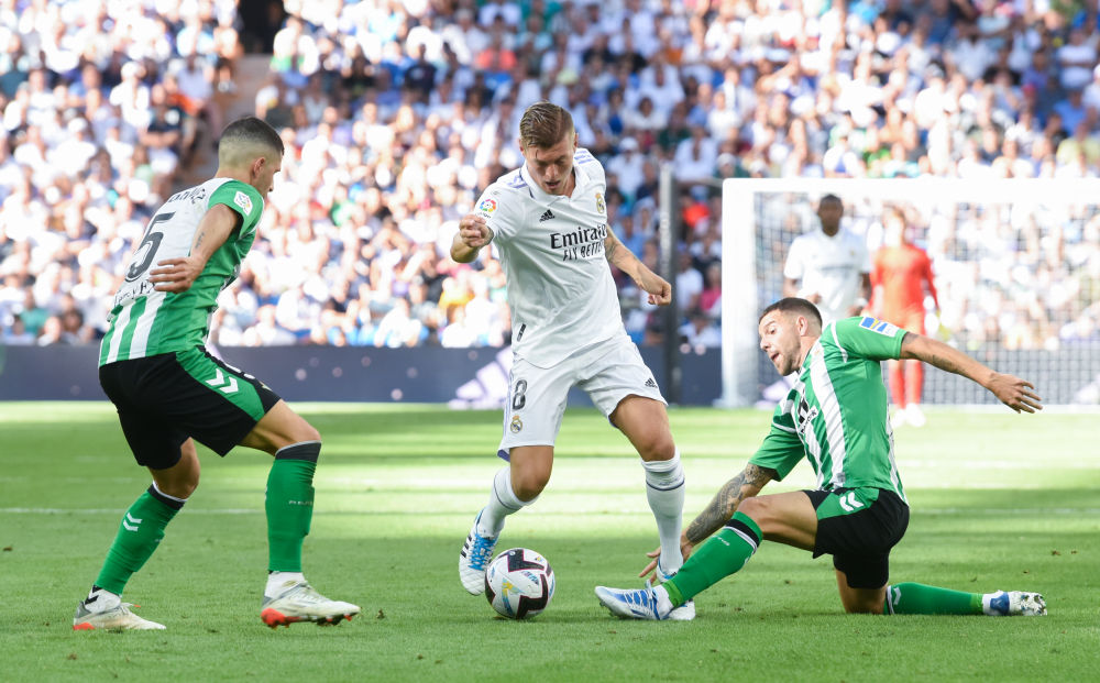 2022年9月3日,克罗斯(中)与鲁伊瓦尔(右)、罗德里格斯在比赛中拼抢。新华社发(古斯塔沃·巴连特摄)