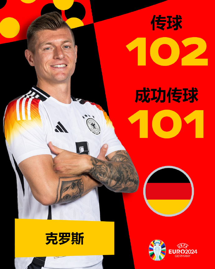 克罗斯在揭幕战中完成102次传球,成功101次。图片来源:欧洲杯社交媒体