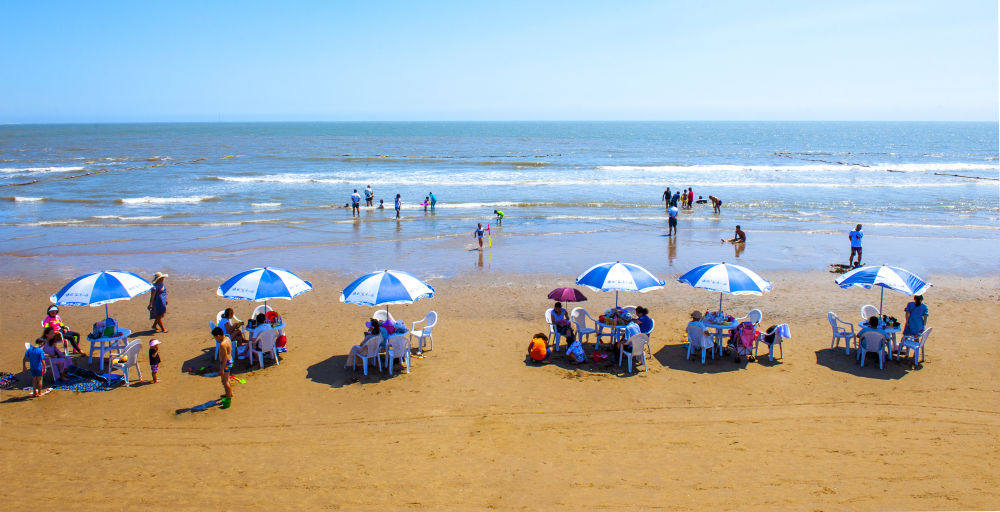 游客在唐山国际旅游岛的沙滩上游玩。图片来源新华社(受访单位供图)
