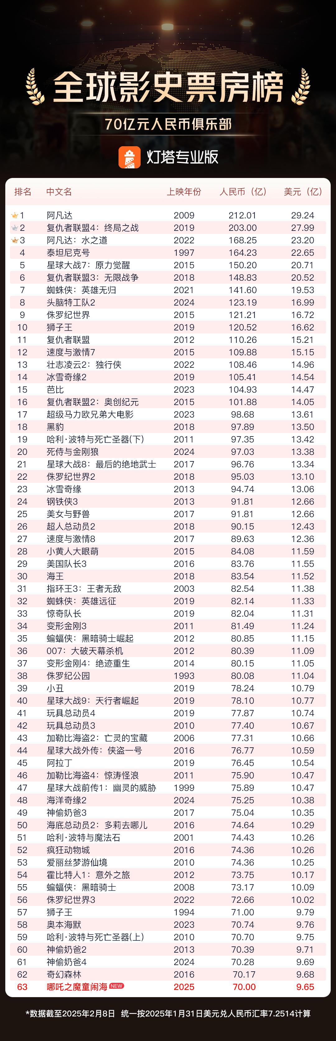 据网络平台数据,截至2月8日,影片《哪吒之魔童闹海》票房(含预售)突破70亿,成为全球影史第63部票房超过70亿(人民币)的影片,打破70亿(人民币)票房俱乐部好莱坞影片垄断。