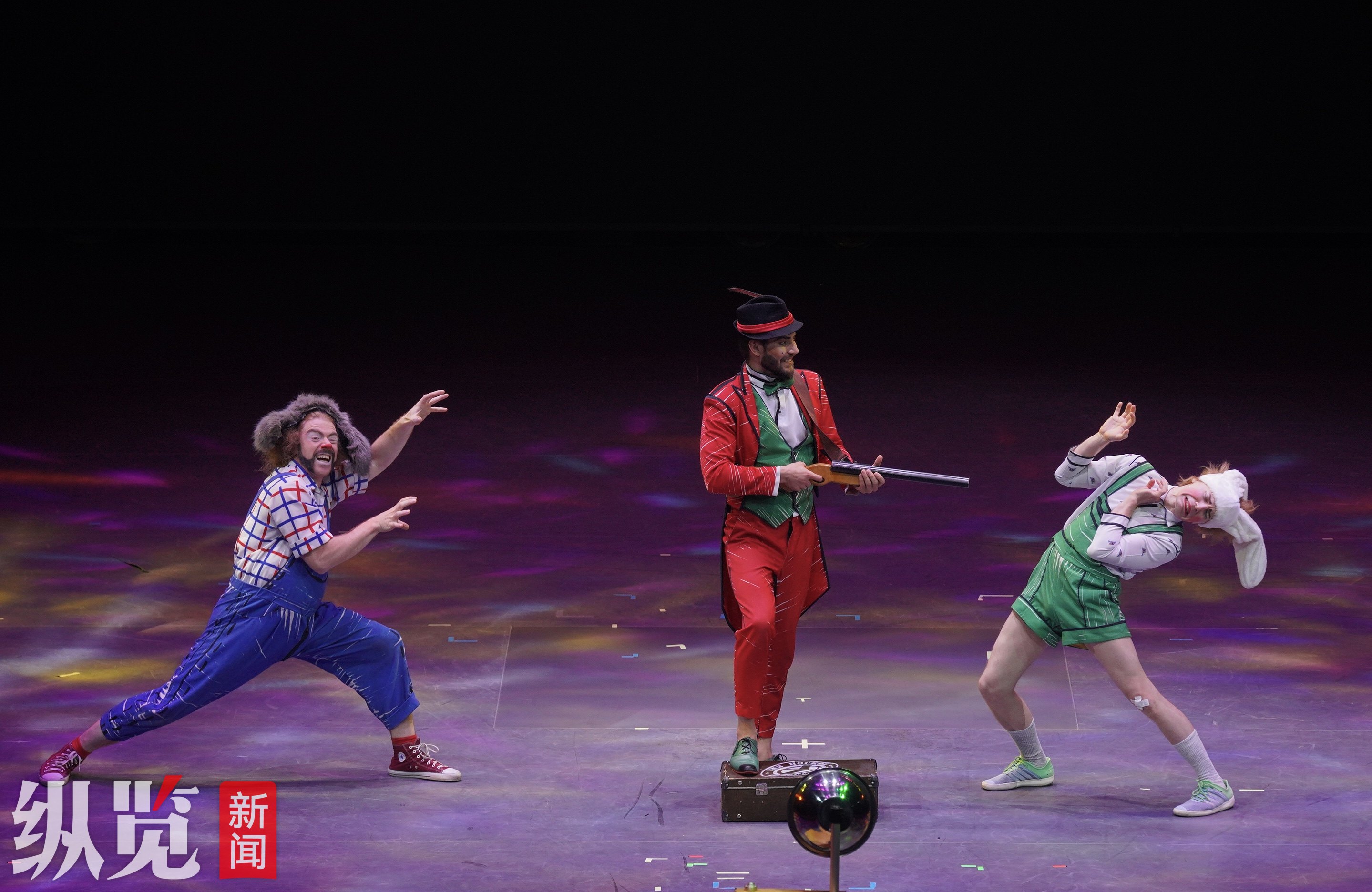 “是谁?”“是他!”俄罗斯“不穿袜子组合”两次登场,红色皮衣,绿色连体裤,黄色爆炸头……滑稽的装扮瞬间吸引全场目光,还会说一些简单的中文与现场观众互动,点燃现场气氛。他们集诙谐幽默与杂技技巧于一身,趣味横生的表演,把观众逗得前仰后合,笑声不断。