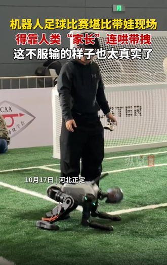 纵览视频丨机器人足球比赛堪比带娃现场,得靠人类“家长”连哄带拽