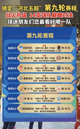 最新赛程出炉!中国银行2025“河北五超”第九轮将于10月11日(周六)全面打响。七场对决同步上演,石家庄与保...