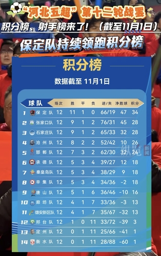 “河北五超”第十二轮战罢,积分榜、射手榜来了!(截至11月1日)